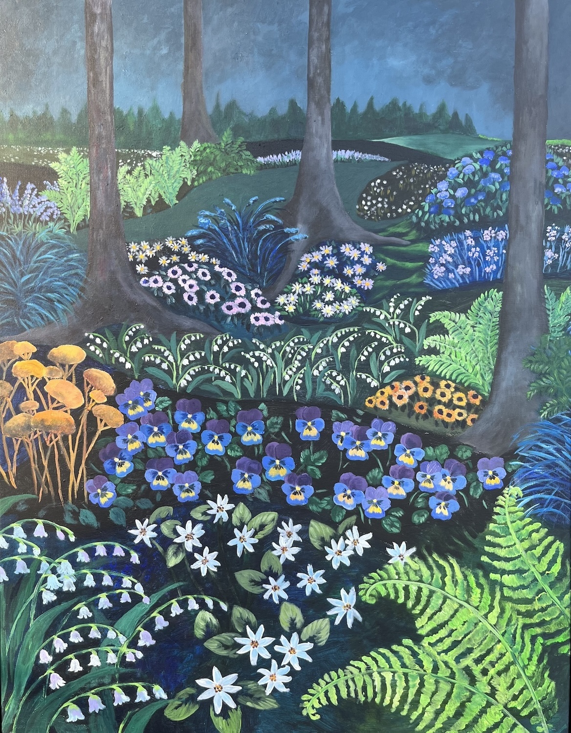 Öinen metsä hengittää salaperäistä elämää. Kun päivänvalo väistyy, kukat alkavat hohtaa ja maisema muuttuu unenomaiseksi – todellisuus ja mielikuvitus sulautuvat toisiinsa.