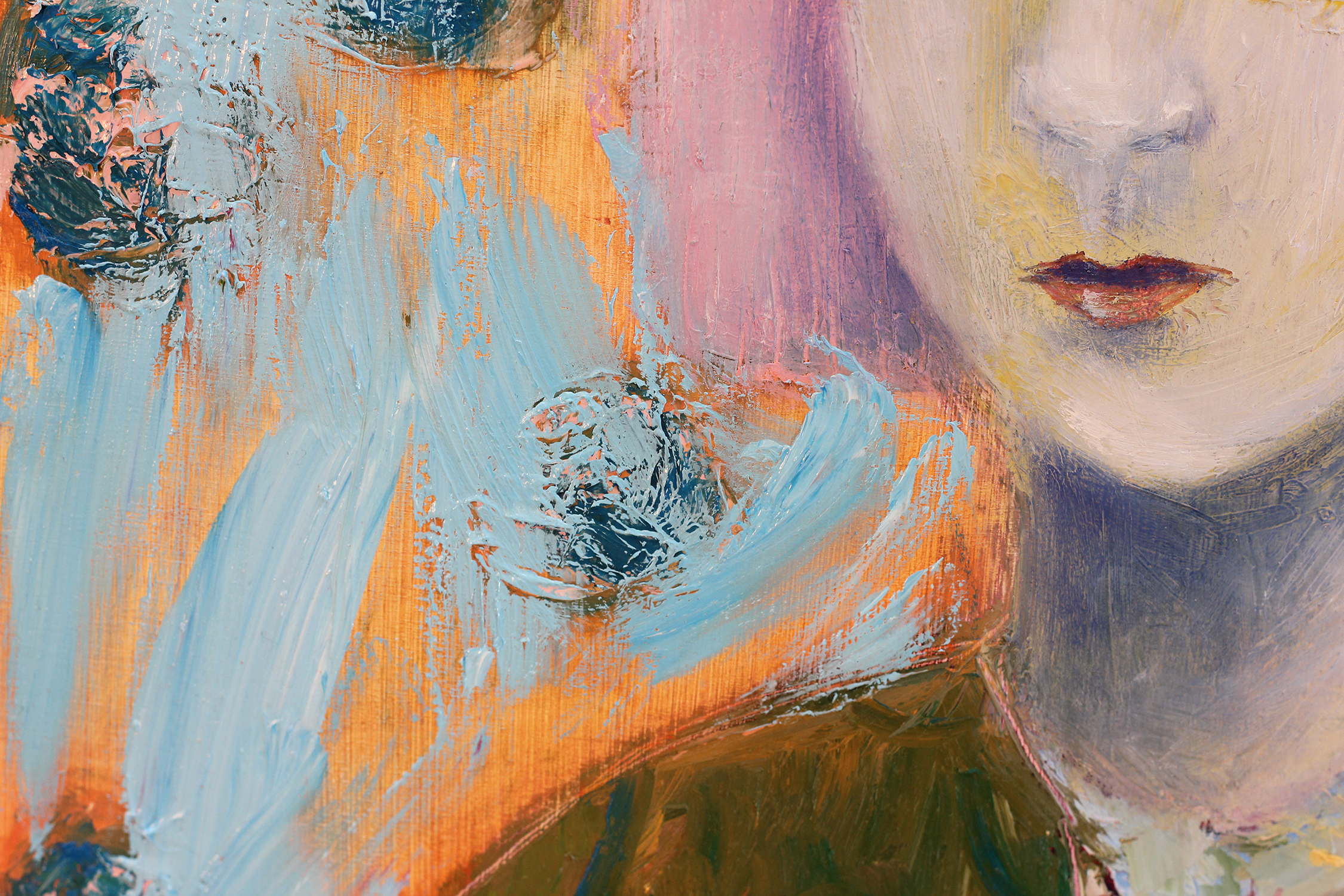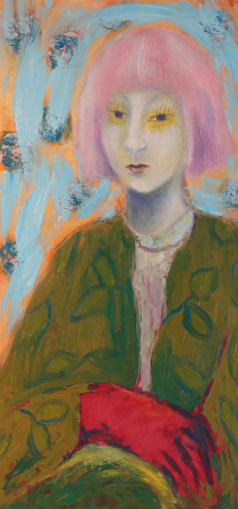 Maalauksessa lämmin, kerrostunut värimaailma luo vaikutelman läsnäolosta ja hiljaisesta intensiteetistä. Vaaleanpunahiuksinen hahmo katsoo suoraan kohti arvoituksellisesti ja pysäyttävästi. Värit ovat eläväiset ja niiden keskinäinen vuorovaikutus on tarkoituksellisesti taianomaista: ilta-auringon oranssi, sammaleenvihreä ja kesätaivaan vaaleansininen luovat jännitteen, joka kutsuu katsojaa tarkastelemaan maalausta pitkään, vuodesta toiseen, sukupolvelta toiselle.