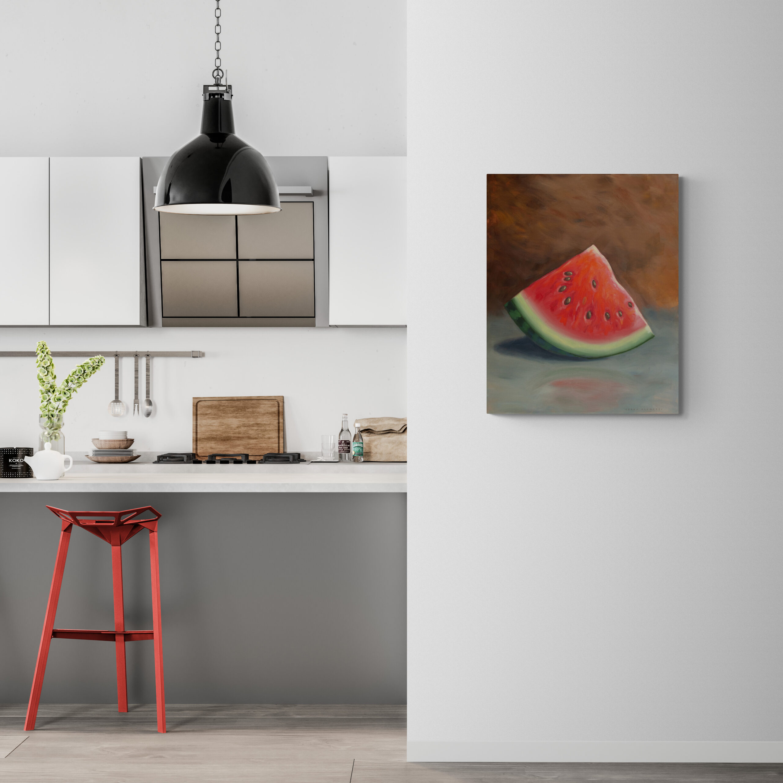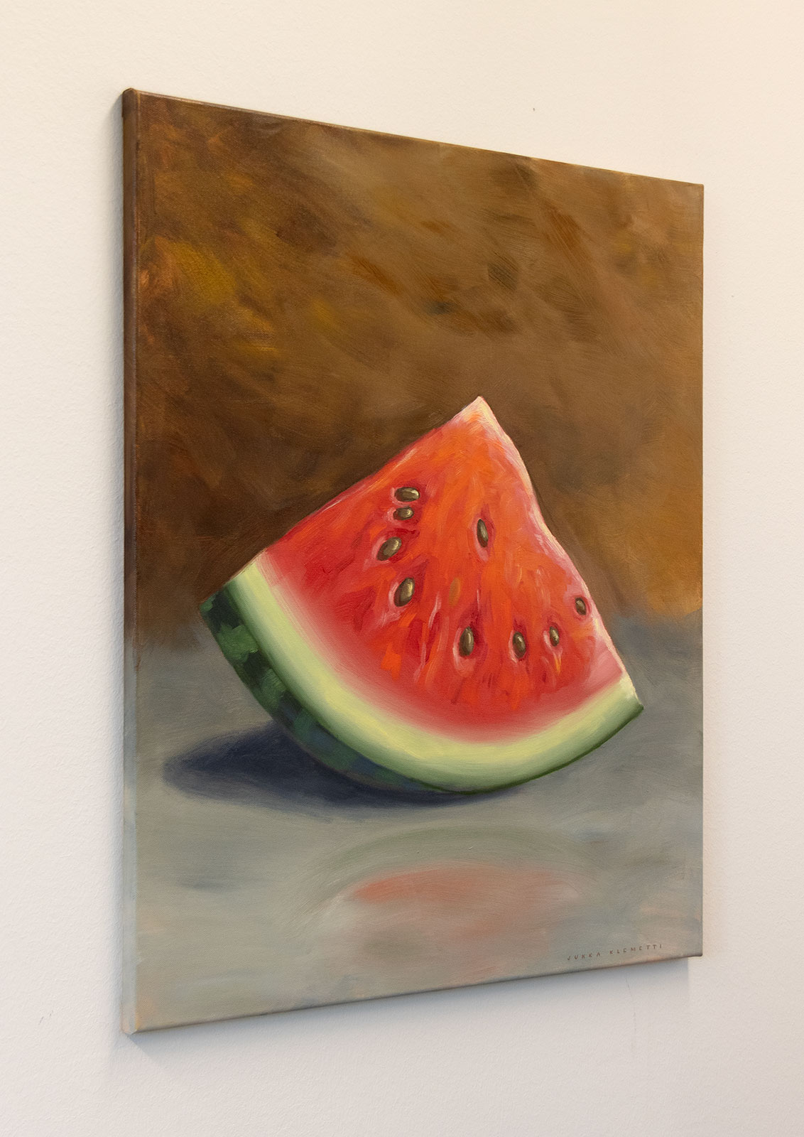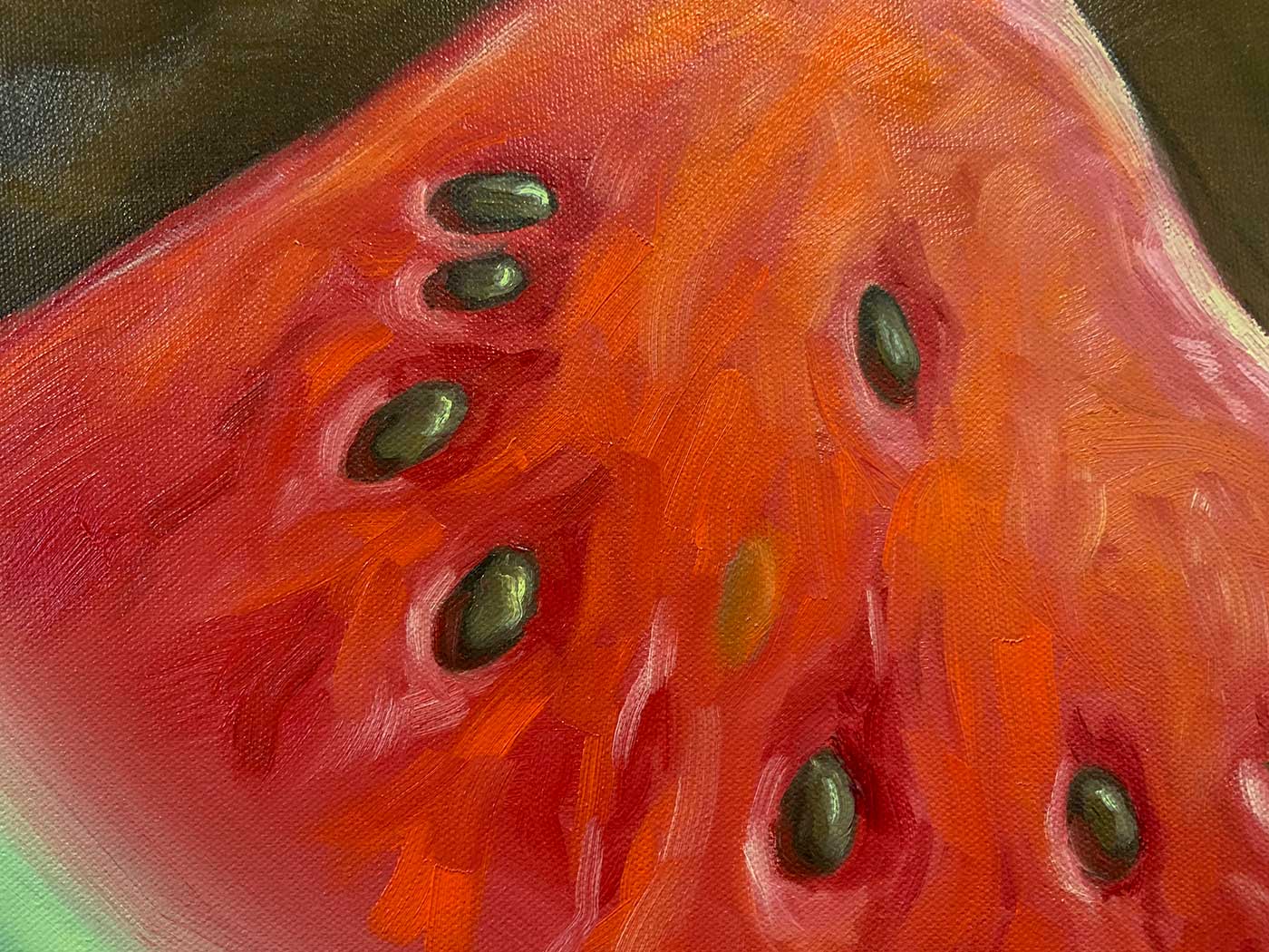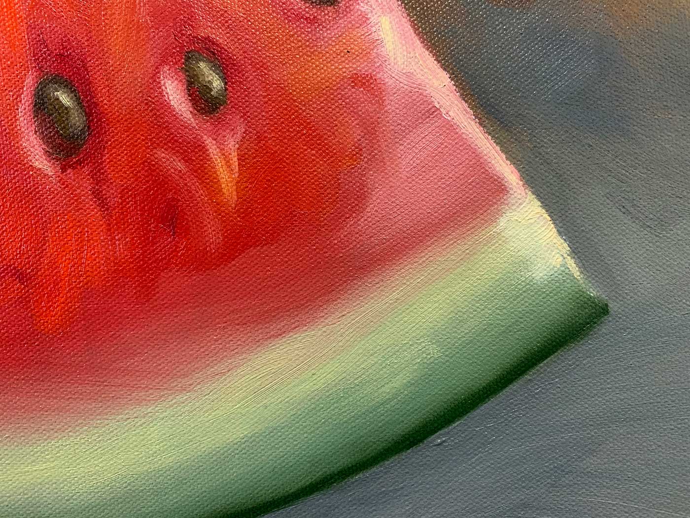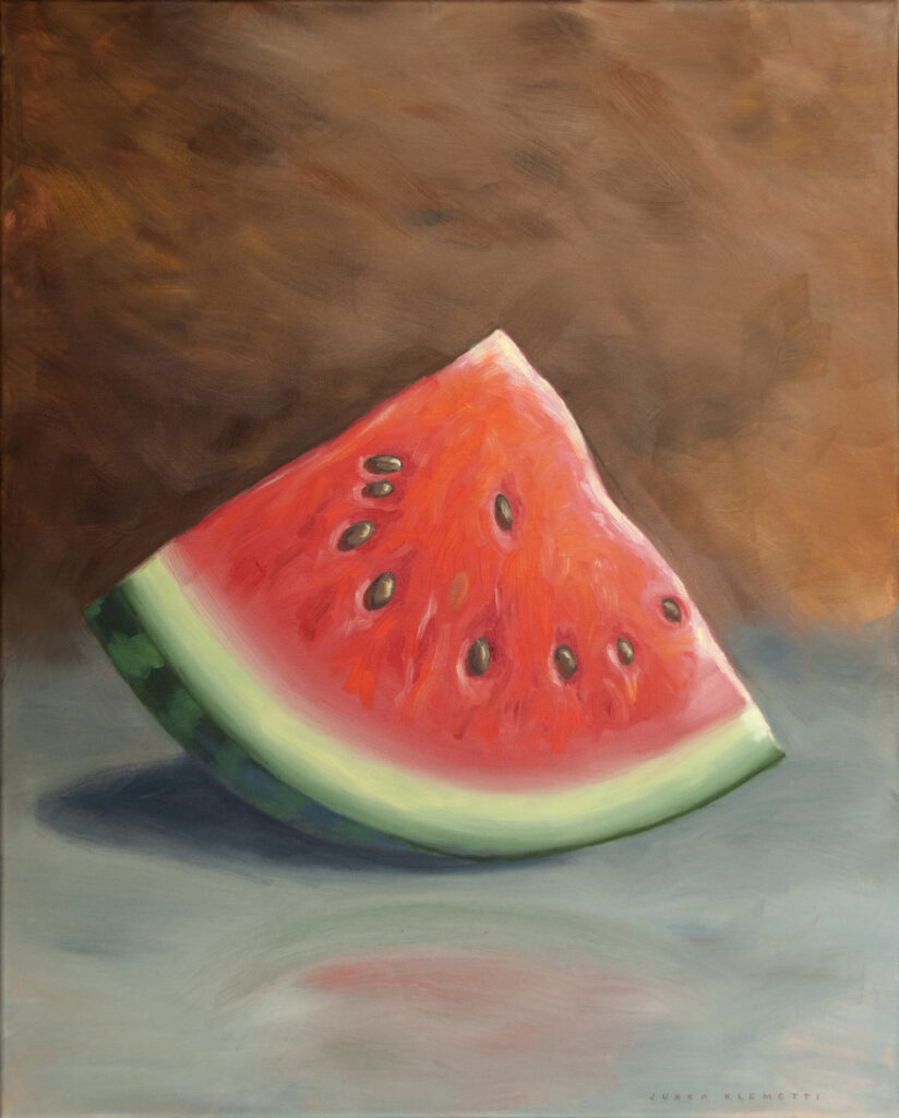 Teoksen mehevän punaisen ja vihreän sävyt tuovat esiin kesän kepeyden ja hedelmän makeuden. Maalaus välittää hetken, jossa yksinkertainen arkinen asia muuttuu eloisaksi ja mehukkaaksi puraisuksi.