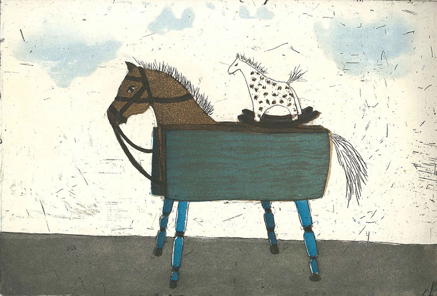 Kyseessä on taittopöytä, joka on muotoutunut puuhevoseksi. On olemassa paljon antiikkisia keinu- ja puuhevosia ja ne siirtyvät sukupolvelta toiselle rakastettuina perintöesineinä. Teoksessa on kuvattu tuota sukupolvien ketjua sillä että pöydän päällä, hevosen selässä on pieni keinuhevonen. Kuvaa voi tulkita vanhemmuuden tai isovanhemmuuden kautta.