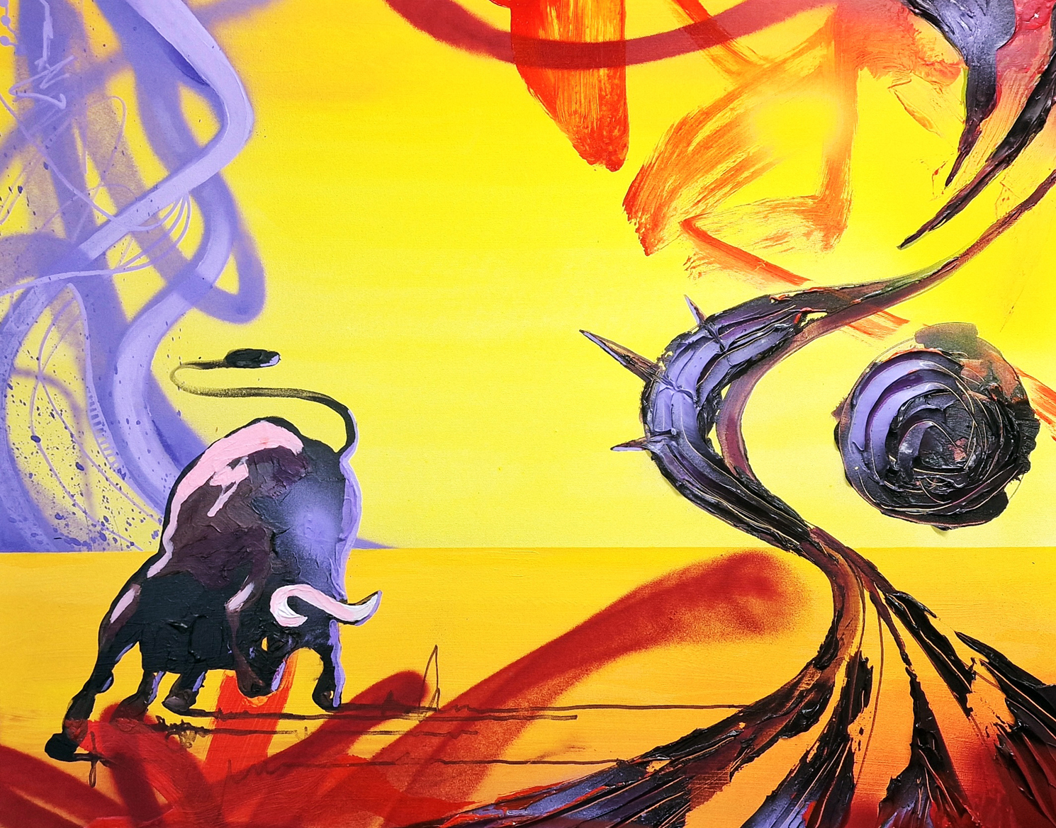 Härkä osaa nautiskella elämän pienistä iloista mehevien makujen ja värien ympäröimänä. Maalaus on akryyli kankaalle (tuubi, tussi ,spray,- ja geeli) ja valmis ripustettavaksi seinällesi.