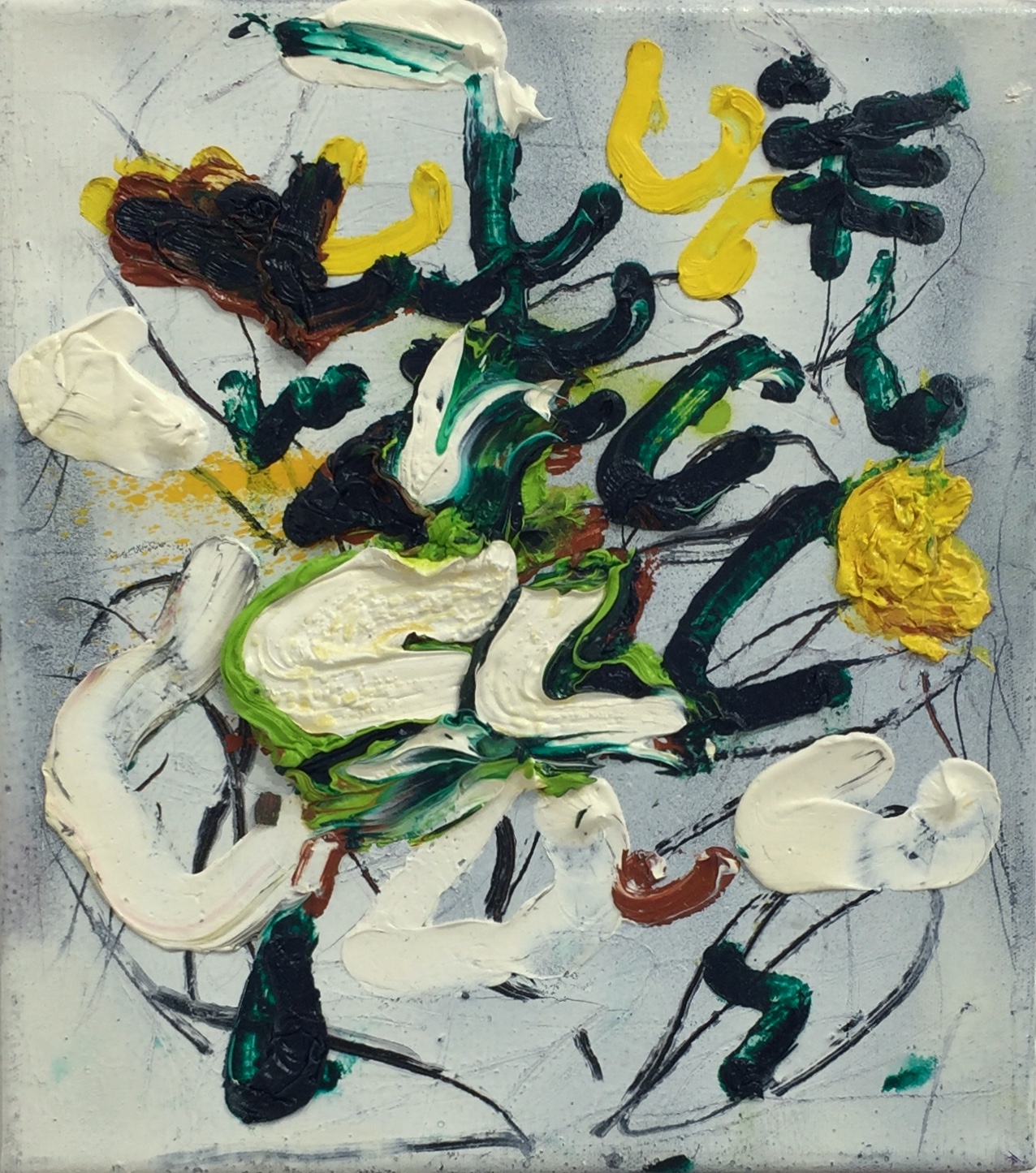 In Korkiakoski ’s latest works colour has emerged more strongly than before, to take its place alongside the rhythm and the line. The colours have been chosen for their feel and visual impact, creating contrasts against the canvas background, while accentuating the black gestures and markings. The black marks are like the artist’s thoughts scribbled on canvas and add their own, new dimension.