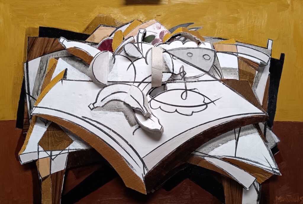 Artistically, he combines painting with layered relief surfaces and collage made from found materials. Each work is built in multiple phases, making the process itself an integral part of the final meaning.